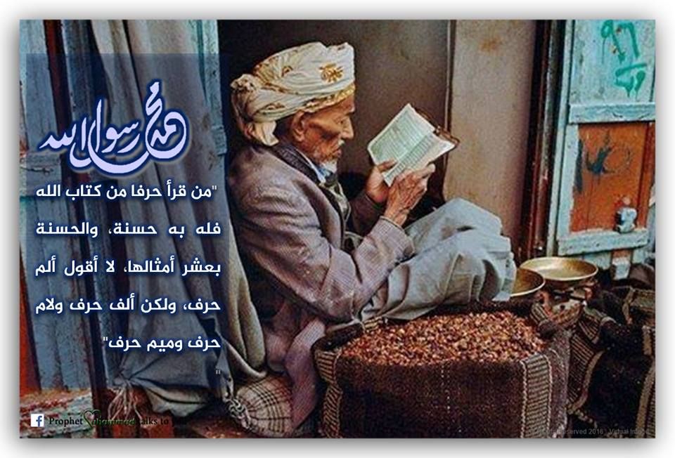 “ผู้ใดอ่านอักษรหนึ่งจากคัมภีร์ของอัลลอฮ์ สำหรับเขาได้รับหนึ่งความดี และความดีนั้นมีผลสิบเท่า ฉันไม่ได้กล่าวว่า อะลิฟ ลาม มีม เป็นอักษรเดียว แต่ อะลีฟคือหนึ่งอักษร, ลามคือหนึ่งอักษร, และมีมคือหนึ่งอักษร”